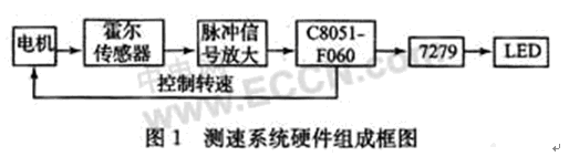 本系統(tǒng)采用單片機(jī)C8051F060作為主控制器,使用霍爾傳感器測(cè)量電機(jī)的轉(zhuǎn)速,通過(guò)7079最終在LED上顯示測(cè)試結(jié)果。此外,還可以根據(jù)需要調(diào)整控制電機(jī)的轉(zhuǎn)速,硬件組成由圖1所示。