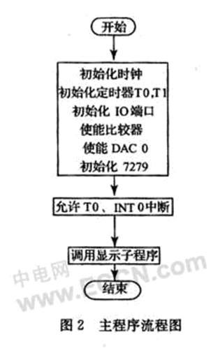 控制器C8051F060主要完成轉(zhuǎn)速脈沖的采集、16為定時(shí)計(jì)數(shù)器計(jì)數(shù)定時(shí)、運(yùn)算比較,片內(nèi)集成的12位DAC0控制轉(zhuǎn)速,并且通過(guò)7279顯示接口芯片實(shí)現(xiàn)數(shù)碼顯示等多項(xiàng)功能。系統(tǒng)采用外部晶振,系統(tǒng)時(shí)鐘SYSCLK等于18432000,T0定時(shí)1 ms,初始化時(shí)TH0=(-SYSCLK/1 000)》8;TL0=-SYSCLK/1 000。等待1 s到,輸出轉(zhuǎn)速脈沖個(gè)數(shù)N,計(jì)算電機(jī)轉(zhuǎn)速值。將1 s內(nèi)的轉(zhuǎn)速值換算成1 min內(nèi)的電機(jī)轉(zhuǎn)速值,并在LED上輸出測(cè)量結(jié)果。