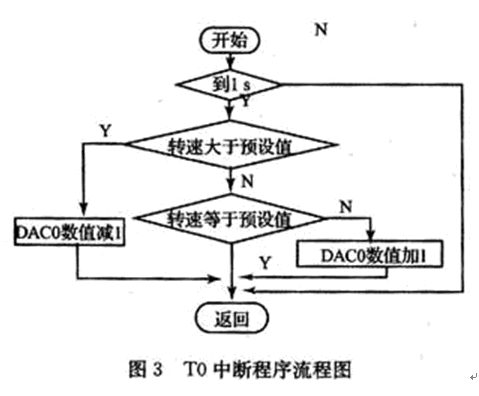 本系統(tǒng)采用C8051F060中的INT0中斷對(duì)轉(zhuǎn)速脈沖計(jì)數(shù)。定時(shí)器T1工作于外部事件計(jì)數(shù)方式對(duì)轉(zhuǎn)速脈沖計(jì)數(shù);T0工作于定時(shí)器方式均工作于方式1。每到1 s讀一次計(jì)數(shù)值,此值即為脈沖信號(hào)的頻率,根據(jù)式(1)可計(jì)算出電機(jī)的轉(zhuǎn)速。由于直流電機(jī)的轉(zhuǎn)速與施加工于電機(jī)兩端的電壓大小有關(guān),故將實(shí)際測(cè)得的轉(zhuǎn)速值與預(yù)設(shè)的轉(zhuǎn)速值比較,若大于預(yù)設(shè)的轉(zhuǎn)速值則減小DAC0的數(shù)值,若小于轉(zhuǎn)速預(yù)設(shè)的轉(zhuǎn)速值則增加DAC0的值調(diào)整電機(jī)的轉(zhuǎn)速,直到轉(zhuǎn)速值等于預(yù)設(shè)定的值,這樣就實(shí)現(xiàn)了對(duì)電機(jī)轉(zhuǎn)速的控制,主程序和T0中斷流程圖如圖2、3所示。