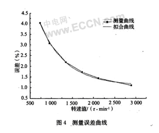 首先在軟件中給出轉(zhuǎn)速預(yù)設(shè)值,即給定常量speed的值,觀察速度穩(wěn)定后七段數(shù)碼管的數(shù)值,比較實(shí)際測(cè)量的轉(zhuǎn)速值和預(yù)設(shè)轉(zhuǎn)速值,計(jì)算測(cè)量誤差,評(píng)價(jià)測(cè)量的準(zhǔn)確性,測(cè)試結(jié)果如表1所示。根據(jù)實(shí)驗(yàn)測(cè)試和誤差分析繪制了測(cè)量誤差曲線,如圖4所示。誤差分析表明,轉(zhuǎn)速測(cè)量誤差在5%以?xún)?nèi),并且隨著轉(zhuǎn)速預(yù)設(shè)值的增加測(cè)量誤差愈小,呈指數(shù)形式下降,函數(shù)關(guān)系如式(3)所示。