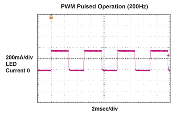控制LED燈源亮度的最好辦法是通過一個低頻PWM脈沖調制LED電流。使用這種方法,LED電流根據占空比的變化觸發脈沖,同時保持電流幅度恒定。這樣,器件發出的光波波長在整個調節范圍內保持不變。