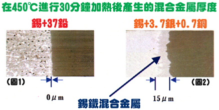 圖1表示當使用63/37傳統焊錫時是近乎不會產生混合金屬的,但當使用錫+3.7銀+0.7銅的無鉛焊錫時便會產生15微米厚度的混合金屬了(圖2)。