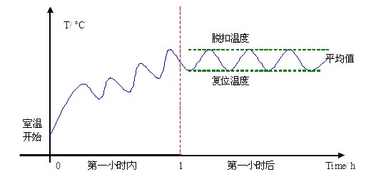 以單相馬達與自動復位熱保護器組合為例說明,其他情況請查閱相關標準。測試在室溫環(huán)境進行,堵轉72小時,其間熱保護器必須因繞組溫度升高斷開電路又自動復位,儀器連續(xù)記錄繞組溫度,圖-1的示意圖由經驗所得。整個過程到結束,必須符合以下結果: