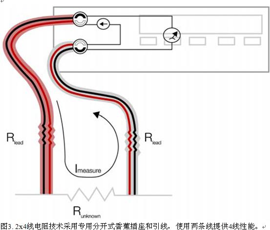 圖2(右)4線電阻測量消除了電壓引線中的電流,消滅了這一誤差來源。