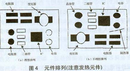 當(dāng)熱性能不同的元件混合安裝時(shí),最好將發(fā)熱量大的元件安裝在下風(fēng)處,放熱小的元件安裝在上風(fēng)處。圖4顯示元件的常規(guī)排列,圖4(b)是將發(fā)熱大的元件安裝在上風(fēng)處,發(fā)熱小的元件(C、IC等)安裝在下風(fēng)處,這樣耐熱差的元件會(huì)處在發(fā)元件散熱的路徑上,其結(jié)果是耐熱性差的元件處較高溫度處。所以,元件最好按圖4(a)排列,實(shí)際上,導(dǎo)體圖形設(shè)計(jì)要達(dá)到圖4(a)的理想排列仍有困難。