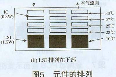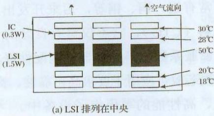 熱性能相同發(fā)熱元器件布置:圖5顯示PCB上安裝IC(0.3W),LSI(1.5W)時(shí)溫度上升的實(shí)測(cè)值。按圖5(a)排列,IC的溫度上升值是18℃-30℃,LSI溫度上升值是50℃。按圖5(b)排列,LSI溫度上升值是40℃,比圖5(a)排列還要低10℃。