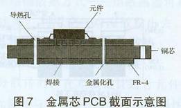 金屬板嵌入多層印制板的中間,其典型結(jié)構(gòu)如圖7金屬芯板本身也可作為地層使用,其上下層可通過(guò)金屬化孔(與芯板絕緣)互聯(lián),并通過(guò)導(dǎo)熱孔實(shí)現(xiàn)熱量在金屬芯板內(nèi)層和表面的傳遞。如圖7所示,發(fā)熱元件可通過(guò)底部和導(dǎo)熱孔直接焊接在板面上,發(fā)熱器件產(chǎn)生的熱直接傳遞到金屬芯板,由金屬芯板經(jīng)導(dǎo)熱孔傳給接觸的安裝機(jī)箱而散發(fā)出去;熱量較大時(shí)可銑去芯板兩邊的絕緣層,通過(guò)邊緣裸露的金屬芯板與機(jī)座接觸散熱,因此具有良好的散熱效果。對(duì)處于密閉機(jī)箱中的電路散熱是一種較好的選擇金屬芯PCB的芯材通常有鋁、銅、鋼等,后來(lái)開(kāi)發(fā)出了覆銅因瓦復(fù)合材料(CIC),它不僅具有良好的導(dǎo)熱性,而且其熱膨脹系數(shù)與半導(dǎo)體器件匹配性好,所制成的CIC金屬芯板可應(yīng)用于要求高可靠性、高組裝密度、高功率、高性能的軍用電子設(shè)備中。