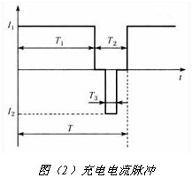 快速充電器根據實時檢測到的電池組的端電壓、充電電流、溫度、動態內阻等信息,按照馬斯充電定律,通過采用智能控制算法實施對充電電流脈沖寬度T1、間歇時間T2、放電電流脈沖T3的分段調節,以消除被充電電池組的電極化現象,使電池組時刻處于較佳的電流接受狀態,提高充電速度和充電效率。具體控制過程是,首先用較寬的充電脈沖進行充電,蓄電池的端電壓上升,當到達充電時間T1時,充電器暫停充電,當充電間歇時間達到T2時充電器繼續充電,如此反復,如圖(2)所示。