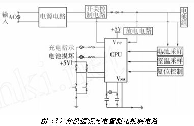 分段恒流充電智能化控制電路如圖(3)所示。該電路采用 CPU 控制,可對充電電池和充電環境溫度進行檢測,對電池充電進行計時,采用充電過程中電池的電壓和電流,對分段恒流充電過程進行控制。