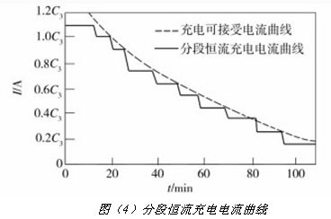 其次,分段恒流充電智能化控制技術通過減小各段恒流值下降梯度(分段數增加),可使實際充電電流曲線更接近充電可接受電流曲線。通過試驗確定該型電池初次恒流值I(1),并減小階段恒流充電的電流下降幅度。如果降低充電電流后,達到充電終止容量梯度值的時間很短 (設定一個最小充電時間),則適當增大電流下降的幅度。分段恒流充電電流曲線如圖(4)所示。