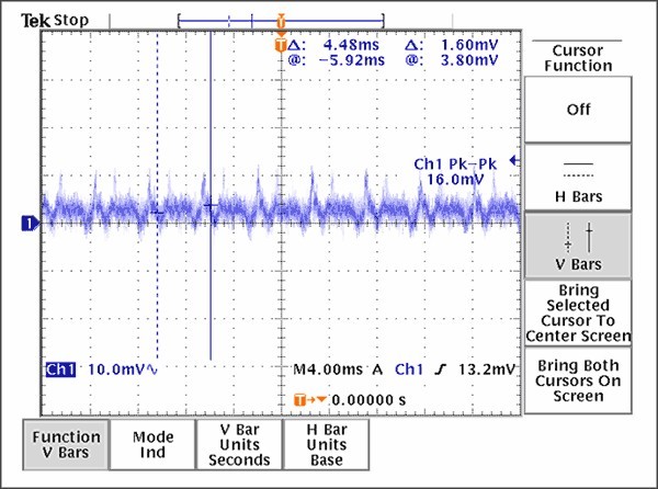 [page]經驗證明,抑制PLL雜散的有效途徑是合理的接地、電源布局和去耦技術,本文討論的布線原則是減小PLL雜散分量的良好設計開端。考慮到電荷泵中存在較大的電流變化,采用星形拓撲非常必要。如果沒有足夠的隔離,電流脈沖產生的噪聲會耦合到VCO電源,對VCO頻率進行調制,通常稱為“VCO牽引”。通過電源線間的物理間隔和每個VCC引腳的去耦電容、合理放置接地過孔、引入一個串聯的鐵氧體元件(作為最后一個手段)等措施可以提高隔離度。上述措施并不需要全部用在每個設計中,適當采用每種方式都會有效降低雜散幅度。圖9提供了一個由于不合理的VCO電源去耦方案所產生的結果,電源紋波表明正是電荷泵的開關效應導致電源線上的強干擾。值得慶幸的是,這種強干擾可以通過增加旁路電容得到有效抑制。圖10顯示的是在電路改變后,在同一點的測量結果。