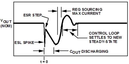 在穩(wěn)壓器的電流源被控制環(huán)路調(diào)整到新值之前的時間間隔內(nèi),ESR兩側(cè)的分壓降低了輸出電壓(這段時間內(nèi)COUT放電電荷量也會相應(yīng)有所減少)。
