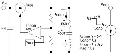 穩(wěn)壓器的電流源(IREG)不能立即發(fā)生變化,因此在“t = 0+”時刻(也就是負載電流增加到IL2的瞬間),IREG = IL1。通過簡單節(jié)點分析得出,此時電流源需要輸出電容: