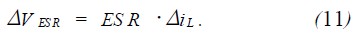 計(jì)算第二部分,對(duì)于一般電容,都具有串聯(lián)等效電感和串聯(lián)等效電阻(其實(shí)還有并聯(lián)等效絕緣電阻)。串聯(lián)等效電感只在較高頻率時(shí)起作用,在分析開關(guān)頻率時(shí)可以將其忽略,但必須考慮的是串聯(lián)等效電阻ESR.電流ΔiC流過(guò)ESR時(shí),會(huì)在ESR兩端產(chǎn)生電壓降,其值為: