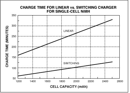 圖6. 對單節(jié)NiMH電池充電時(shí),線性充電器和開關(guān)充電器的充電時(shí)間不同