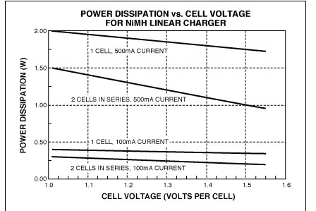 圖5. 采用5.0V電壓的USB端口對NiMH電池充電時(shí),線性調(diào)整器件的功耗[page]