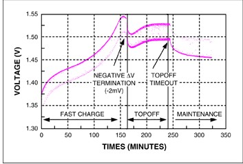 通常采用恒流源對NiMH電池充電。當(dāng)達(dá)到充滿狀態(tài)時(shí),會發(fā)生放熱化學(xué)反應(yīng),并導(dǎo)致電池溫度上升,電池端電壓降低??蓹z測電池溫度上升速率或者負(fù)向電壓變化率,并用來終止充電。這些充電終止方法分別稱為dT/dt和-ΔV。充電速率非常低時(shí),dT/dt和-ΔV不太明顯,很難精確檢測到。電池開始進(jìn)入過充狀態(tài)時(shí),dT/dt和-ΔV響應(yīng)開始顯現(xiàn)。此時(shí)如果繼續(xù)充電,將損壞電池。