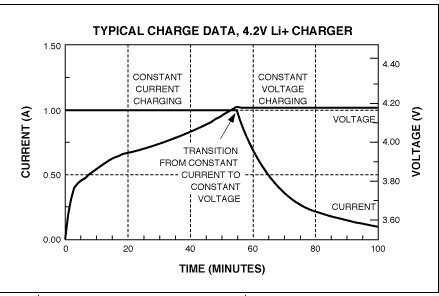 圖2. 使用CCCV充電器對Li+電池充電時(shí)的典型曲線