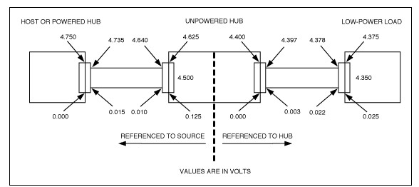 當(dāng)USB端口帶有一個(gè)總線供電的USB集線器,集線器上接了低功耗設(shè)備時(shí),USB口上允許的直流電壓跌落如圖1所示。大功率負(fù)載與總線供電的集線器連接時(shí),電壓跌落將超過圖1給出的指標(biāo),并會引起總線過載。