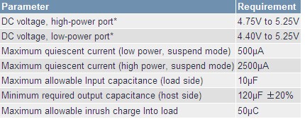 在符合USB 2.0規(guī)范的主機(jī)中,大功率端口的上游端具有120uF、低ESR電容。所連接的USB設(shè)備的輸入電容限制在10?F以內(nèi),在最初的負(fù)載連接階段,允許負(fù)載從主機(jī)(或自供電集線器)吸取的最大電荷數(shù)為50?C。這樣一來,當(dāng)新設(shè)備連接至USB端口時(shí),上游端口的瞬態(tài)電壓跌落小于0.5V。如果負(fù)載正常工作時(shí)需要更大的輸入電容,則必須提供浪涌電流限制器,以保證對更大的電容充電時(shí)電流不會超過100mA。