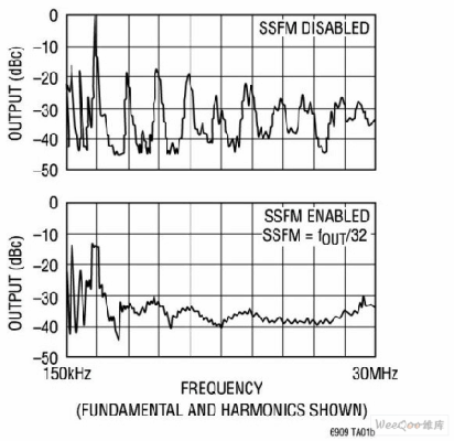 除了多相同步之外,還可以通過連續改變開關穩壓器時鐘的頻率來改善EMI。這種被稱為SSFM的技術不允許發射能量在任何接收器的頻段中停留過長的時間,從而改善了EMI。為了最大限度地發揮SSFM的效用,主要有4個必需考慮的因素:受影響接收器的帶寬、頻率調制的方法、頻率擴展量和調制速率。