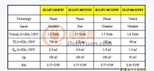表1顯示了四個擁有相同尺寸的IGBT的參數值。前三個IGBT采用同樣的平面式技術,但使用不同的壽命復合控制計量。從表中可見,標準速度的IGBT具有最低Vce(on) ,但與快速和超速平面式IGBT相比,標準速度的IGBT下降時間最慢。第四個IGBT是經優化的槽柵IGBT,能夠為太陽能逆變器這類高頻率切換應用提供低導通和開關損耗。請注意,槽柵IGBT的Vce(on) 和總切換損耗 (Ets) 比超速平面式IGBT低。