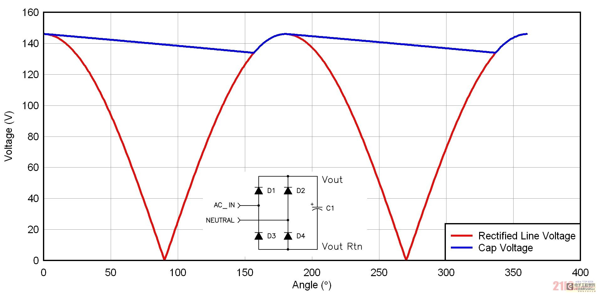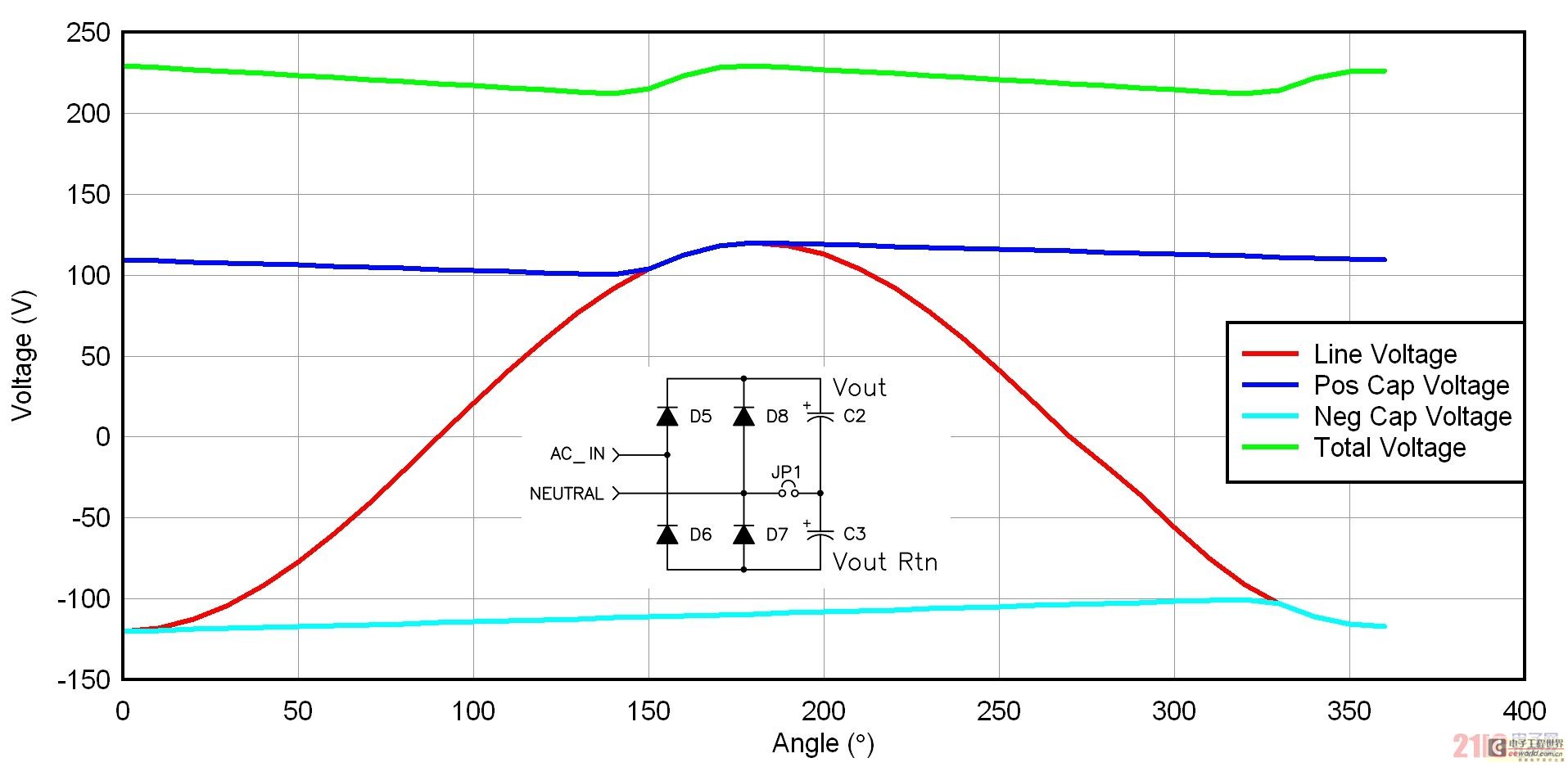 圖 2 描述了一種倍壓器整流配置結構,許多 115/230 VAC 應用都使用了這種結構。如果您有一個 230 VAC 應用,則您的輸入級需要處理最大輸入電壓(265 VAC)乘以峰值因數這么大的電壓,其接近 400 伏。在與一個 115 VAC 輸入一起使用時,倍壓器將經過整流的電壓,增壓至接近 230 VAC 輸入電平。我們可以專為 230 VAC 線壓設計一個電源,以此來減小電源工作的整流后電壓范圍。我們通常使用一個跳線或者開關,來實現不同整流器配置之間的切換。這種方法的唯一缺點是偶爾出現人為倍增 230 VAC 輸入的情況,從而對電源造成嚴重破壞。圖 2 顯示了倍壓器電路的一些波形。電容之間不帶電。兩個整流器交替對每個電容施加輸入電壓。一個周期中,每個電容都被充電至峰值線壓,這樣它們每個都有一個線頻率紋波部分。由于電容為異相位充電,因此其和的紋波頻率為線頻率的兩倍。