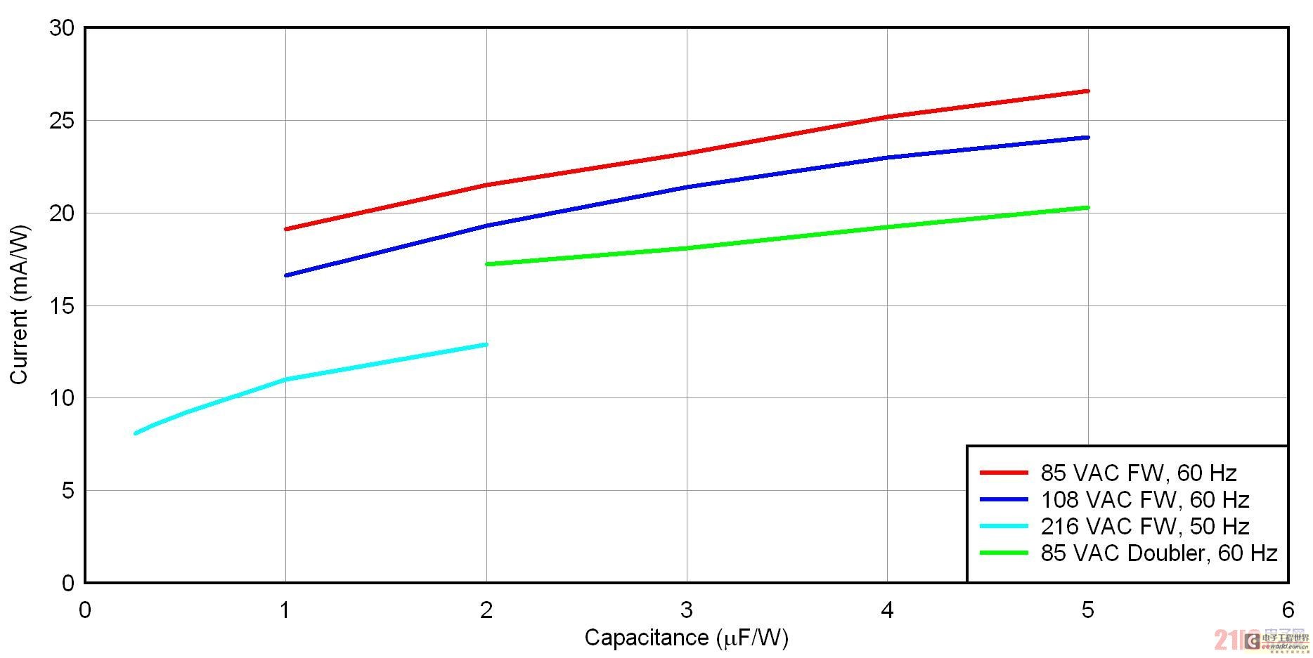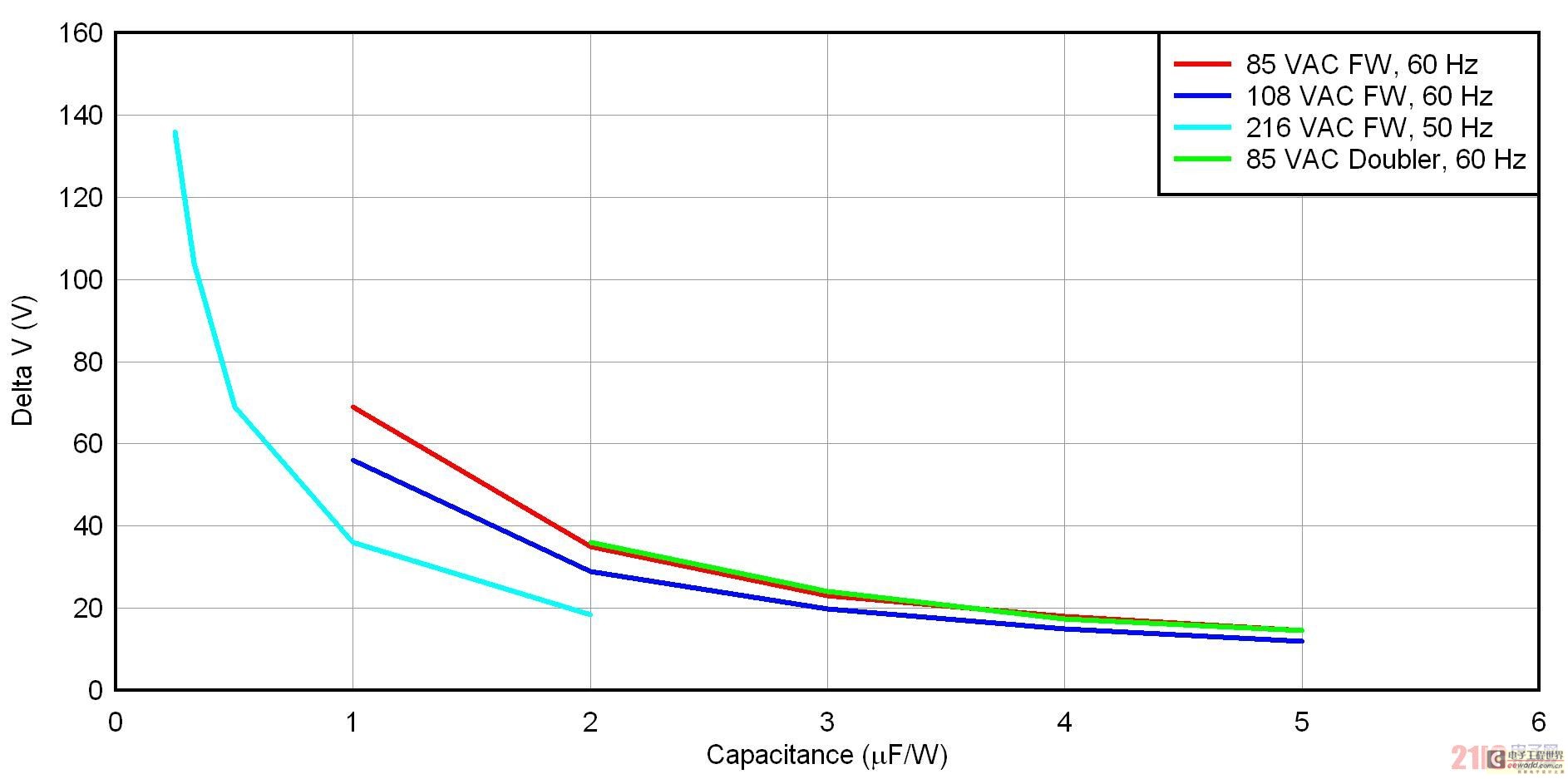 圖 3 顯示了四種整流器/輸入電壓方法的 uF/W 標準化壓降。共有三種全波橋接方法,適用于低線壓美國(108 VAC/60 Hz)、低線壓日本(85 VAC/50 Hz)和低線壓歐洲(216 VAC/50 Hz)。另外,還有一個低線壓日本的倍壓器。就全波橋而言,標準化過程只需將電容除以功率。在倍壓器中,標準化方法是將兩個串聯電容之一的電容除以功率。要想使用該曲線圖,請首先確定您的整流器配置結構,并選擇一個可以接受的壓降。之后,您只需讀取輸入電容的 uF/W 便可。最后,通過乘以您的功率,便可去標準化。