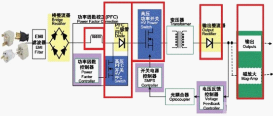 在一個(gè)電源設(shè)計(jì)中,能效規(guī)范對電路段的挑戰(zhàn)主要體現(xiàn)在PFC能效、主轉(zhuǎn)換器能效和次級能效幾個(gè)方面。要提高這幾個(gè)方面的能效,就必須改善如圖1所示電路紅色框中的元件性能。以下將介紹改善電路段能效的幾種方法。