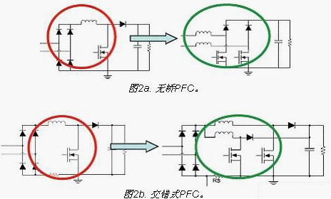 改善PFC能效的目標(biāo)是為了實(shí)現(xiàn)功率因數(shù)校正短的效率達(dá)到96%以上。采用無橋PFC(圖2a)可以減少橋損耗,采用交錯式PFC(圖2b)可以滿足較高功率應(yīng)用的要求,以提升PFC能效。此外,還可以利用IC技術(shù)減少開關(guān)損耗,并利用更優(yōu)化的拓?fù)浣Y(jié)構(gòu)來減少EMI濾波器損耗。