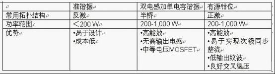 要提高主轉(zhuǎn)換器能效可以采用以下幾種方法。一是通過降低導(dǎo)通阻抗(開關(guān)損耗較高)和/或減小初級峰值電流和均方根電流來降低初級導(dǎo)通損耗;二是考慮采用軟開關(guān)技術(shù)降低開關(guān)損耗;三是通過減少整流器壓降(使用低正向壓降二極管或FET整流器)來降低次級損耗;四是采用更好的磁芯材料來降低磁芯損耗。表1列出了主要軟開關(guān)的拓?fù)浣Y(jié)構(gòu),可供設(shè)計(jì)時(shí)參考。