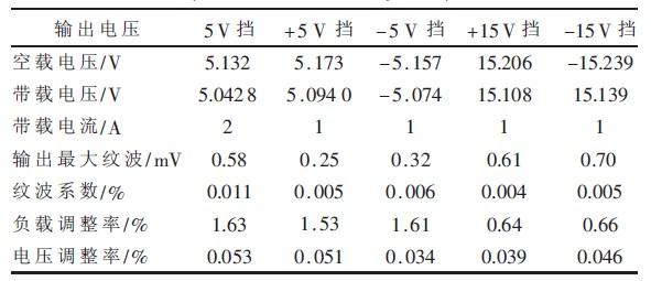 測試儀器采用固緯4 位半數字萬用表(GDM-8245) 、上海愛儀交流毫伏表(AS2294D) 和調壓變壓器(TDGC -0.5/0.5) .負載電阻采用水泥電阻(2.5Ω/20 W、5Ω/20 W、15Ω/20 W) .電源性能參數如表1 所示。可以看出, 負載調整率和電壓調整率反映出了電源較高的穩定度, 紋波系數指標反映出低紋波特性。