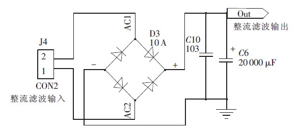 整流濾波電路主要由整流橋堆和大容量濾波電容組成, 如圖2 所示。整流橋堆具有體積小巧、輸出電流大、安裝方便等優勢, 并能代替由4 只二極管組成的傳統橋式整流電路。濾波電路采用大容量電解電容濾波,增加了輸出電壓的穩定性。根據式(1) 可求出所需濾波電容容量。