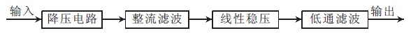 本設計由降壓模塊、整流濾波模塊、線性穩壓模塊和低通濾波模塊組成, 如圖1 所示。變壓器將220 V/50 Hz 交流電分別降壓到±16 V、±6 V、+6 V, 通過整流橋堆整流以及大容量電容濾波后, 進入正( 負) 線性穩壓模塊, 再經過低通濾波模塊濾除直流以外的干擾信號, 分別輸出±15 V、±5 V、+5 V 的穩定電壓。