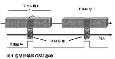 特定的手機(jī)只在屬于它的時(shí)間空當(dāng)發(fā)射。包絡(luò)信號(hào)的基本頻率是1/4.615 ms=217Hz。諧波頻率為434Hz、651Hz等。如此頻率是聽得到的。如圖4所示,為手機(jī)的包絡(luò)信號(hào)。