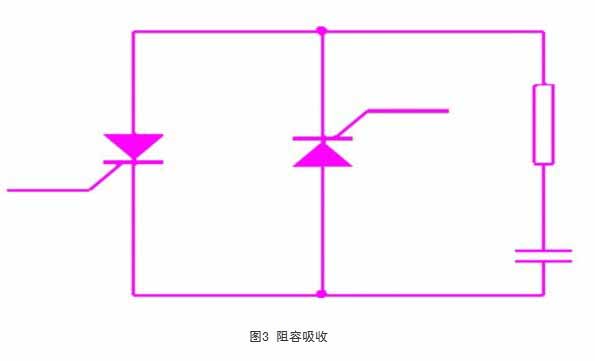在晶閘管兩端并聯(lián)r-c阻容吸收回路,如圖3所示,利用電容吸收過壓。其實(shí)質(zhì)就是將造成過電壓的能量變成電場能量儲(chǔ)存到電容中,然后釋放到電阻中消耗掉。
