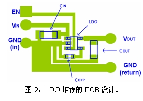 如在TCXO(溫度補(bǔ)償晶振)電源中,其只需要5mA的負(fù)載電流,Vout固定,若能控制Vin的值僅稍大于Vout+Vdrop,(一般地,CMOS LDO的Vdrop在Iout=5mA條件下,其值為5mV~10mV),則LDO的自身功耗Pd在不到1mW,這取決于方案設(shè)計工程師在應(yīng)用電路中的設(shè)計。