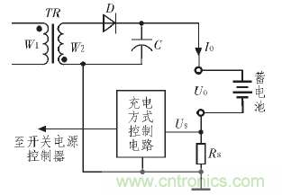 為了提高開關(guān)電源工作的可靠性,防止輸出電流過流等情況發(fā)生,許多開關(guān)電源在輸出端接入電流傳感器,檢測輸出電流的大小,一旦輸出電流超過設(shè)計標準,保護電路即采取必要措施保護開關(guān)電源的安全[3]。此外,當開關(guān)電源作為蓄電池充電器時,也需要檢測輸出電流的大小,以此了解蓄電池的充電情況,適時切換充電方式,達到提高充電效率,延長蓄電池的使用壽命的效果。圖3 為一個蓄電池充電器的輸出電流檢測原理圖, 電流檢測電阻RS將蓄電池的充電電流轉(zhuǎn)化為電壓US,反饋給充電方式控制電路,由控制電路根據(jù)充電電流的大小適時切換充電方式[4]。