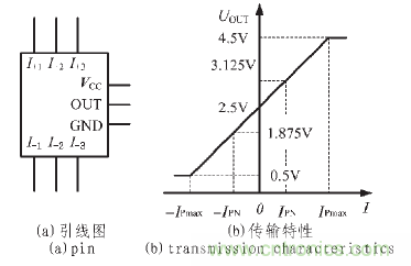 常用的TBC-DS 系列閉環(huán)霍爾電流傳感器的引線框圖和傳輸特性如圖5 所示[6]。圖5(a)所示的霍爾電流傳感器引線中,I+1~3和I-1~3是被測電流的串入繞組引腳, 其中,I+1和I-1是一個被測電流繞組的引腳,I+2和I-2、I+3和I-3也分別各是一個被測電流繞組的引腳。當3 個被測電流繞組并聯(lián)時,霍爾電流傳感器的額定測量電流為IPN1; 若將兩個繞組并聯(lián)再與一個繞組串聯(lián)時,霍爾電流傳感器的額定測量電流為IPN2;若將3 個繞組相互串聯(lián)時,霍爾電流傳感器的額定測量電流為IPN3。3 個額定測量電流間的關(guān)系為:IPN1=2 IPN2=3 IPN3。可見,通過3 組被測電流繞組的不同接法,可以改變霍爾電流傳感器的額定測量電流值,擴展測量區(qū)間。VCC為電源引腳,電源電壓通常為5 V;GND 是電源和傳感器輸出電壓的地;OUT 是傳感器電壓輸出引腳。由5(b)所示的霍爾電流傳感器傳輸特性可見,當被測電流為0 時,其輸出電壓UOUT =2.5 V;當被測電流不為0 且方向為從I+至I-時,輸出電壓UOUT>2.5 V,當被測電流不為0 且方向為從I-至I+時,輸出電壓UOUT<2.5 V。IPN和-IPN是霍爾傳感器的正負額定電流, 當被檢測電流達到額定電流時,根據(jù)電流方向的不同,輸出電壓UOUT 的值分別為3.125 V 或1.875 V, 即相對于2.5 V 的中心值有±0.625 V的偏移。當被檢測電流值絕對值大于IPN 時,霍爾傳感器仍可輸出與被檢測電流成線性關(guān)系的電壓值,直至被檢測電流達到霍爾傳感器的最大檢測電流IPmax。通常,IPmax>3 IPN。