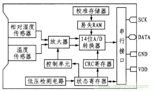 SHT15型傳感器是單片、多用途的智能傳感器,其中不僅包含基于濕敏電容器的微型相對濕度傳感器和基于帶隙電路的微型溫度傳感器,而且還有14位的A/D轉換器和2線串行接口。能輸出經過校準的相對濕度和溫度的串行數據,所以系統中不再使用傳統設計需要的多路轉換開關、A/D轉換器及信號調理電路,系統結構比較緊湊和簡單,SHTl5能在同一位置測量相對濕度和溫度。它的內部結構如圖1所示