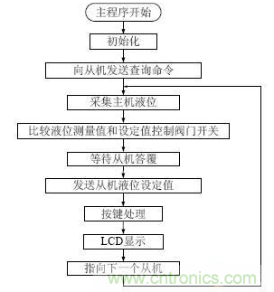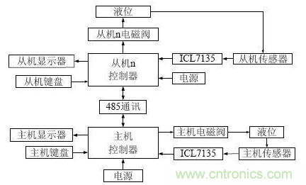 基本工作流程為:主機通過鍵盤設定自己和從機的液位,超聲波傳感器測出當前水位對應的電壓值,再經過ICL7135 模數轉化送入控制器與設定值比較,單片機通過控制電磁閥調節主機液位,并把設定值與當前值顯示在LCD 上;主機控制器通過485 通訊對從機控制器傳輸設定值,從機控制器也可以如主機控制器一樣對液位進行控制,并通過LCD 顯示主機給定值與當前液位值;并利用485 通訊把從機當前液位傳送給主機顯示出來。