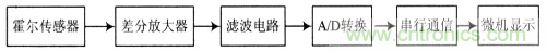 系統可以分為3個部分。第一部分是信號源,由霍爾傳感器產生電壓信號,信號通過差分放大,濾波得到較清晰的信號;第二部分是信號經過A/D轉換送入單片機進行處理,再通過串行通信送入PC機處理得到結果;第三部分是數據的顯示,這部分是通過VB的繪圖程序來完成,顯示結果以v-x關系圖來顯示。系統總流程如圖1所示。