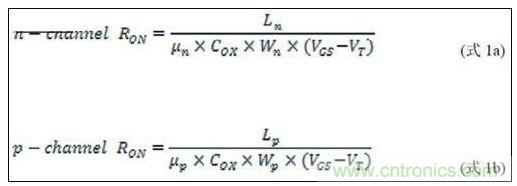 在VIN為各種電平條件下,p溝道和n溝道RON的并聯值形成并聯結構的RON特征(圖2)。RON隨VIN的變化曲線在不考慮溫度、電源電壓和模擬輸入電壓對RON影響的情況下為直線。為使信號損耗和傳輸延遲最小,理想情況下的RON應盡量小。然而,降低RON將增大MOSFET硅片的寬度/長度(W/L)比,從而造成較高的寄生電容和較大的硅片面積。這種較大的寄生電容降低模擬開關的帶寬。如果不考慮W和L,RON是電子和空穴遷移率(μn和μp)、氧化物電容(COX)、門限電壓(VT)及信號電壓、n溝道及p溝道MOSFET的信號電壓VGS (VIN)的復合函數,如式1a和1b所示。