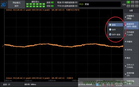 第四步,找到了想要觀察的波形幀之后,可以通過“FORM按鍵調整界面的窗口時間,對波形進行任意放大或縮小”并可以調出光標測量任意兩點的橫縱軸數據??吹竭@里我相信大部分人已經可以找到自己想要看的波形了。但是想要把波形存儲記錄下來怎么辦,而且想要長時間記錄可以實現嗎?不要急,PA功率分析儀還提供波形保存記錄功能。
