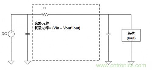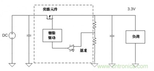 圖1. 線性穩壓器框圖。注意,旁路元件將在其自身和負荷之間形成一個分壓器,起到耗散功率的作用。