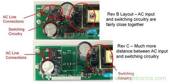 圖2.從電路板布局進行 EMI 掃描,其中 AC 輸入與開關電路距離較近