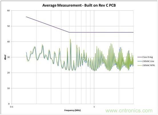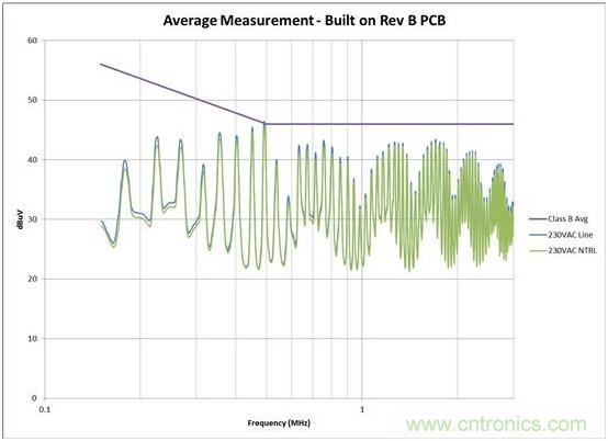 我通過簡單調整電路板(無電路變化),將噪聲降低了大約 6dB。見圖 2 和圖 3 的測量結果。在有些情況下,接近高 dV/dt 進行輸入線路布線甚至還可擊壞共模線圈 (CMC)。