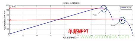 因為光伏電池陣列是單位光伏電池組串組成的,每個組串都有自己的工作電壓,電壓很大概率上不一致,如果以傳統的集中式方案的話,組串在匯流箱能量匯集時并聯會發生一次并聯失配,匯流箱到逆變器能量并聯時再發生一次并聯失配,嚴重影響光伏電池組件的發電效率。如下圖3所示,單路MPPT的情況下,光伏電池組件受到各種因素的影響,會導致出現兩個或多個波峰的情況,跟蹤到任何一個波峰都會對發電量造成損失。而如果多路MPPT的情況下,能精確跟蹤到每一個組串的特性,形成多條MPPT曲線,使得每串光伏電池組串最大效能的發揮作用。