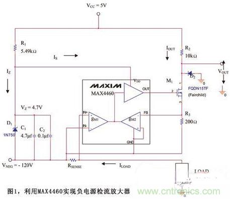 圖1所示電路提供了一種負(fù)電源電流檢測(cè)的原理框圖,利用MAX4460或MAX4208儀表放大器,配合一些分立元件實(shí)現(xiàn)。