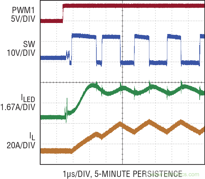 衡量 LED 驅(qū)動器性能的最重要指標(biāo)之一是 LED 電流在 PWM 調(diào)光時的恢復(fù)速度。在 PWM 接通信號上升沿之后的頭幾個開關(guān)周期中,驅(qū)動器的表現(xiàn)對最終產(chǎn)品的質(zhì)量有很大影響。LT3744 采用專有 PWM、補(bǔ)償和時鐘同步技術(shù),提供無閃爍性能,甚至在驅(qū)動 LED 至 20A 電流時也是如此。